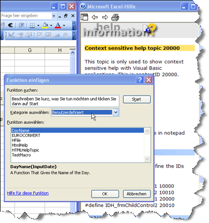 So, wie Sie sehen können, gibt es zwei Funktionen "DayName" und "TestMacro" auf der Dialogbox. Klicken Sie "Hilfe für diese Funktion", um das Hilfefenster aufzurufen und das Thema zur Funktion z.B. mit der Kontext-ID 20000 anzuzeigen.