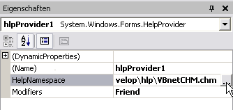 Aktivieren Sie die hlpProvider Komponente und stellen Sie die HelpNameSpace Eigenschaft von hlpProvider1 auf den Dateinamen ein, mit dem Sie arbeiten wollen. Hier verwenden wir eine CHM Datei. CHM Dateien sind in einem komprimierten ITStorage Format, das vom Microsoft HTMLHelp Workshop verwendet wird.