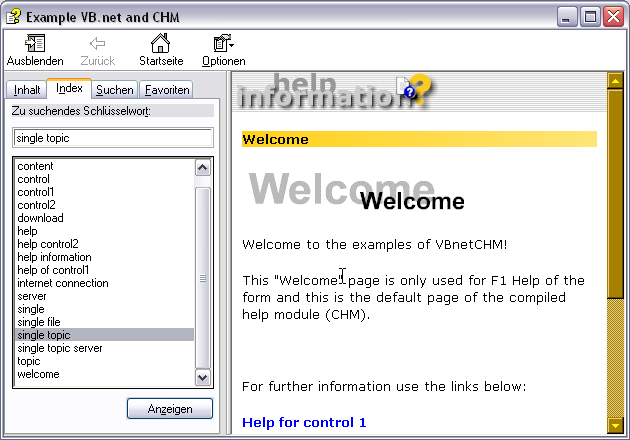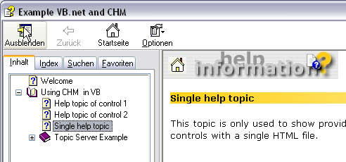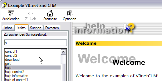 Hinweis: Der Aufruf ist von der aktuell geöffneten Registerkarte (Inhalt oder Index) beim letzten Schließen des CHM Hilfefensters abhängig.