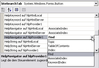 Der nächste Schritt soll die HelpNavigator Eigenschaft eines Steuerelements (z.B. ein Button) auf einen Wert der HelpNavigator Enumerations (siehe Tabelle unten) setzen. Hier verwenden wir Topic.