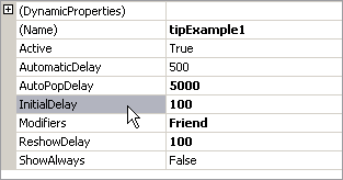 Die Windows Forms ToolTip Komponente hat mehrere Merkmale, die Sie einstellen können. Die ToolTip Komponente kann so konfiguriert werden, dass es eine Verzögerung gibt, bevor der ToolTip Text angezeigt wird.