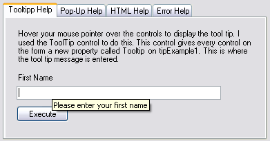 Me.tipExample1.SetToolTip(Me.btnExecute, "Clicking this button generates a message for you")