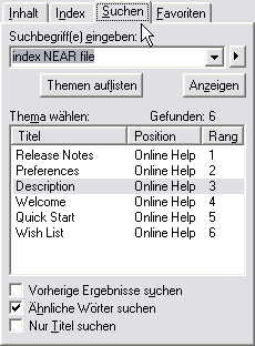 Wenn Sie nach Wörtern in Hilfethemen suchen, können Sie angeben, dass jedes Vorkommen des Wortes oder Ausdruckes wonach Sie suchen, in den Themen hervorgehoben wird.